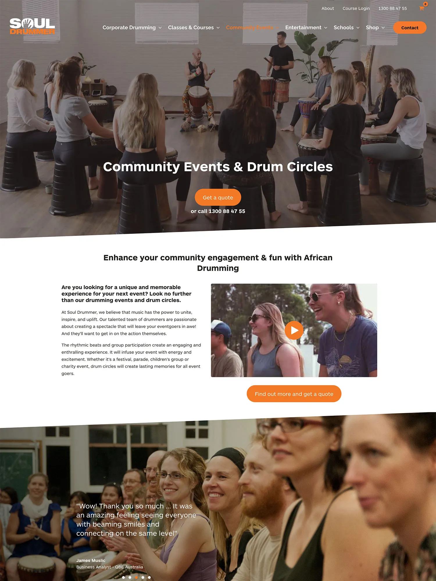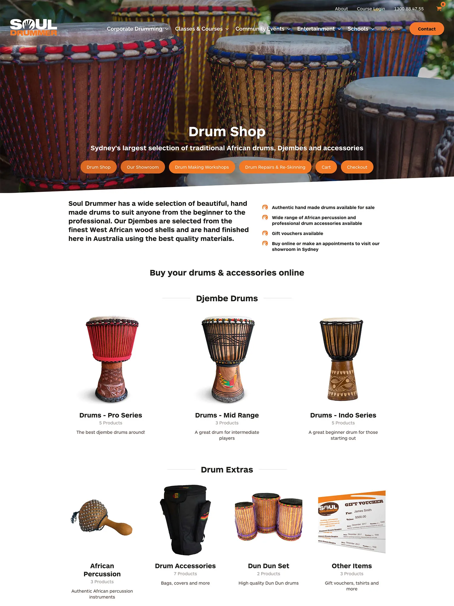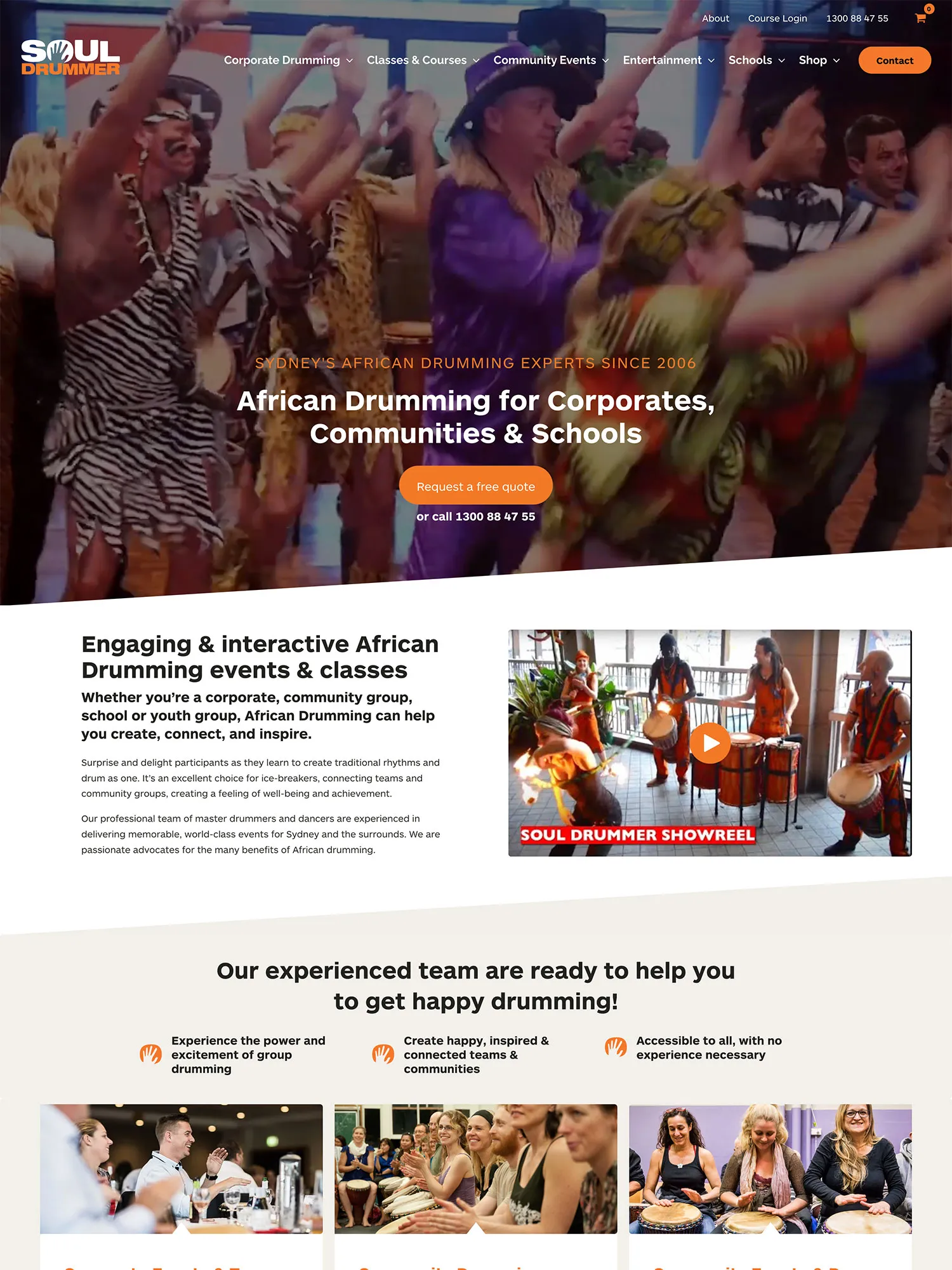 We’ve partnered with them over that time to grow and evolve their branding, digital and marketing presence. We employed a lot of video and motion on the website to capture and embody the connection, creativity and joy that is a Soul Drummer experience. The website also is the marketing hub of the Soul Drummer business, hosting course ticket sales, drum sales and their online drumming course.