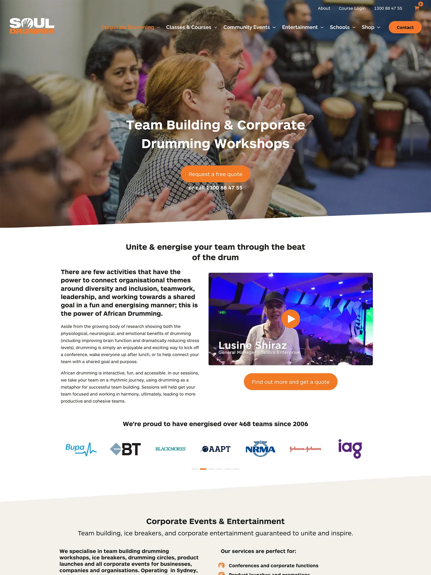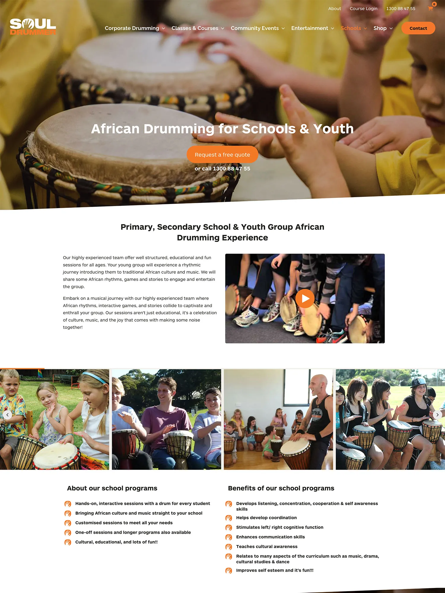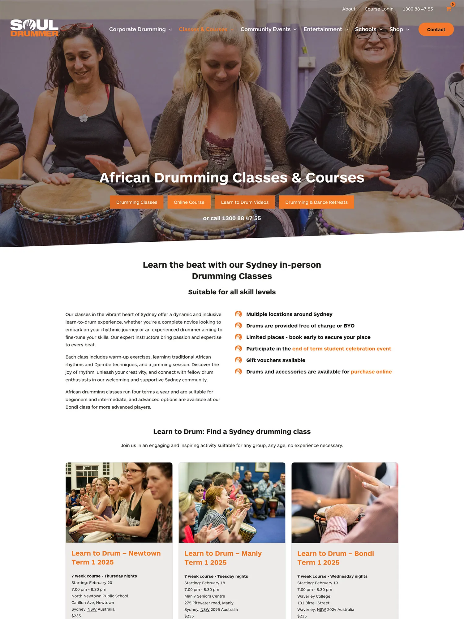 We’ve partnered with them over that time to grow and evolve their branding, digital and marketing presence. We employed a lot of video and motion on the website to capture and embody the connection, creativity and joy that is a Soul Drummer experience. The website also is the marketing hub of the Soul Drummer business, hosting course ticket sales, drum sales and their online drumming course.